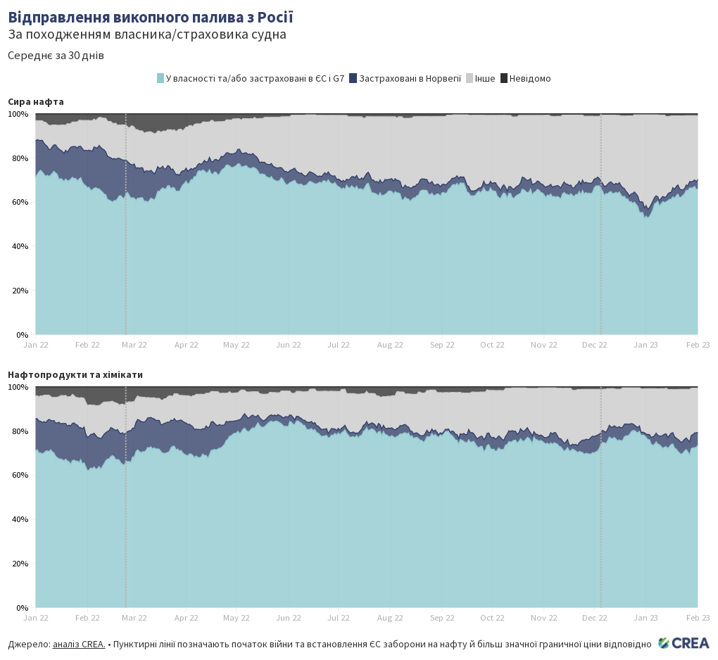 Частка танкерів, на які поширюється гранична ціна щодо постачання сирої нафти з Росії, склала близько 65%. Для нафтопродуктів і хімічних речовин рівень охоплення коаліцією за обмеження ціни залишається високим і становить понад 70%. Високий рівень цих часток свідчить про важелі впливу, які має коаліція за обмеження ціни для зниження граничної ціни.