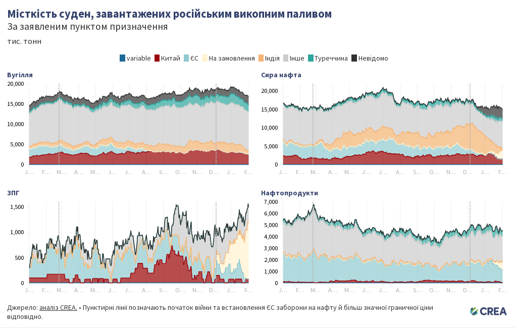 Центр досліджень енергетики та чистого повітря (CREA) опублікував свій щотижневий огляд експорту викопного палива з Росії.