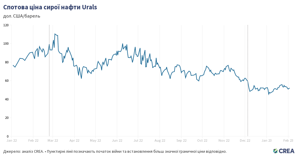 Ціни на нафту марки Urals перевищували 50 дол. США за барель, залишаючись нижчими за граничну ціну в 60 дол. США. Однак ціна нафти, яку постачають трубопроводом Східний Сибір — Тихий океан (ESPO), що здебільшого стосується китайських закупівель, була вищою за граничну, хоч і впала до 69 дол. США на початку лютого.