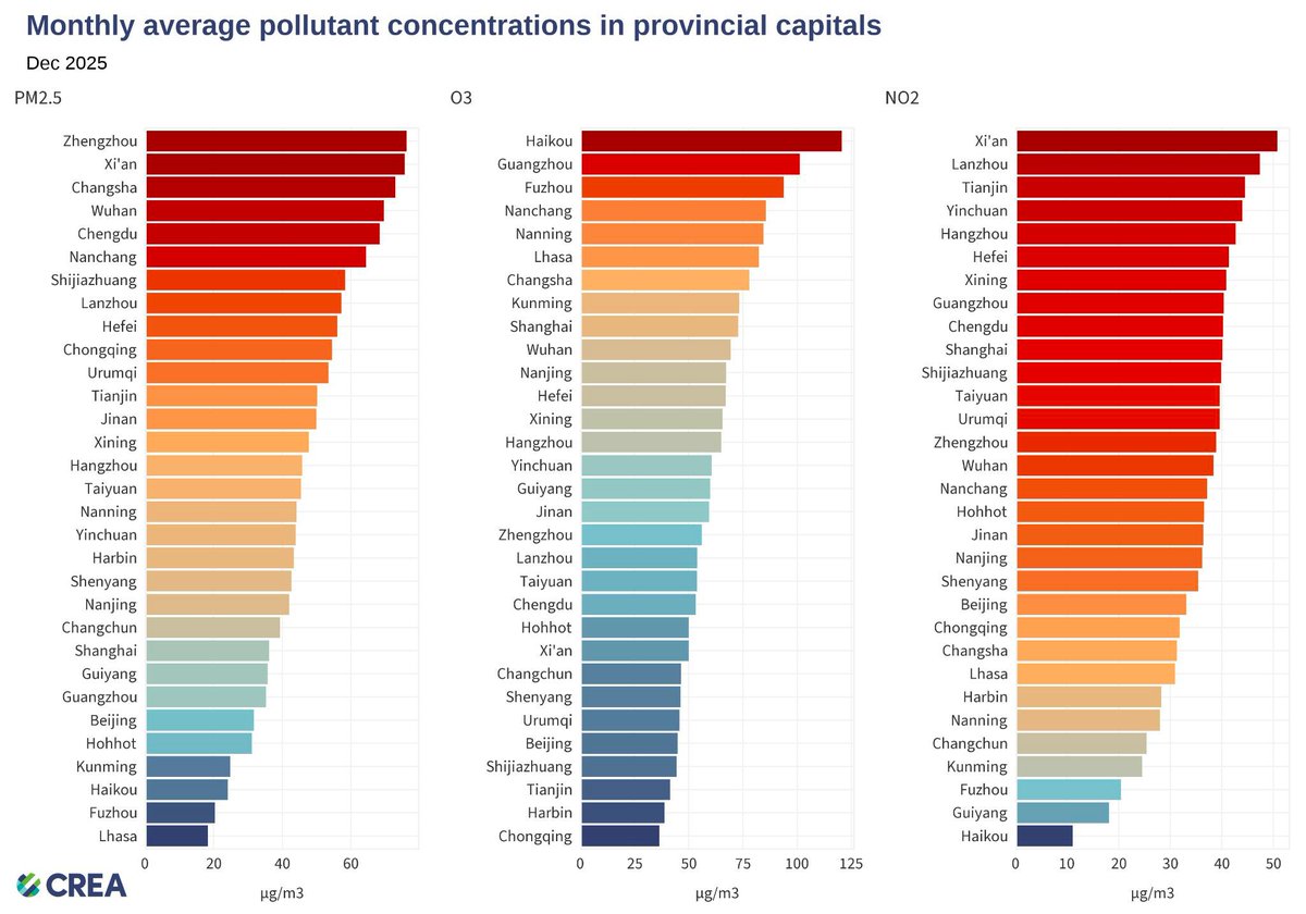 💨 In Dec. 2025, Zhengzhou (Henan) & Xiʼan (Shaanxi) had highest monthly average PM2.5 among all provincial capitals; ozone pollution was highest in South China in Haikou (Hainan); Xiʼan had highest nitrogen dioxide (NO₂)