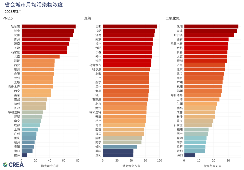 - 3月份二氧化氮(NO₂)浓度最高的是沈阳,为37微克/立方米;天津和哈尔滨分别为36微克/立方米和34微克/立方米。二氧化氮不仅直接危害健康,也是PM2.5和臭氧形成的重要前体物。