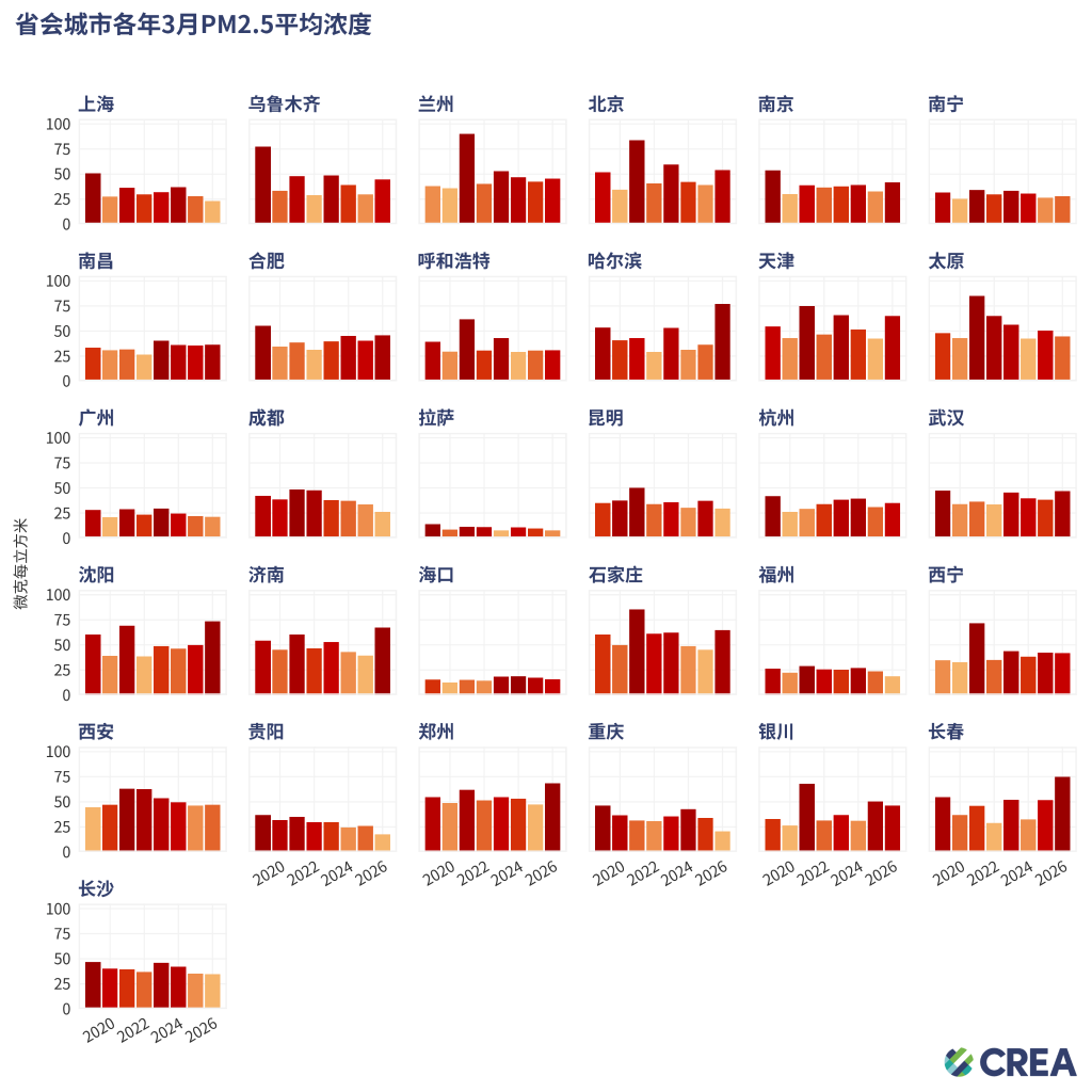 - 3月份,共有18个省会城市PM2.5浓度水平同比上升,其中增幅较大的城市主要集中在东北地区和京津冀地区。