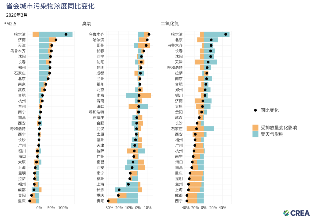 - 在臭氧方面,南京、郑州和哈尔滨是受排放因素推动同比增幅最大的省会城市。