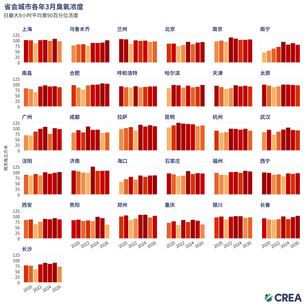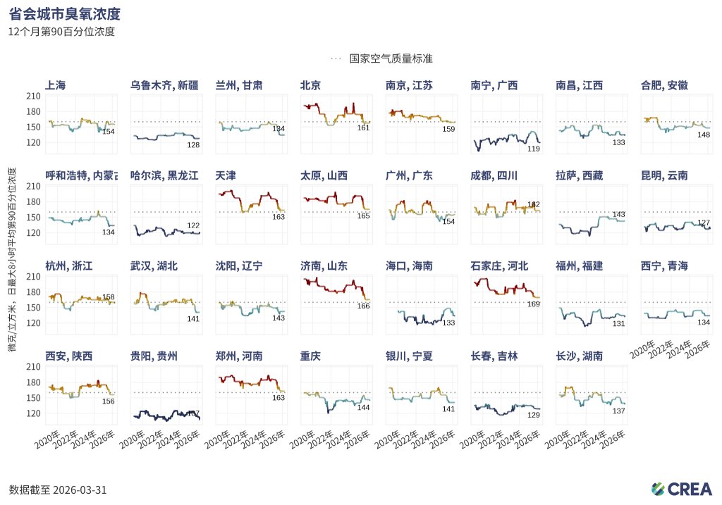 - 截至2026年3月底,31个省会城市中有7个城市的臭氧12个月第90百分位浓度高于160微克/立方米的国家标准。