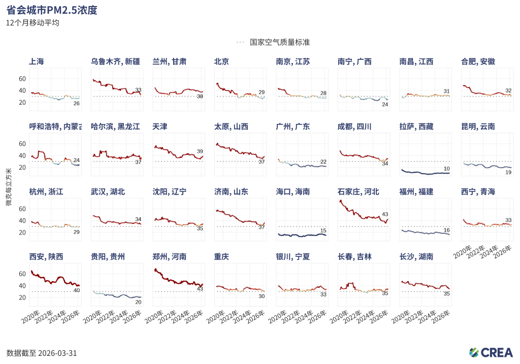 - 随着中国自2026年3月起将PM2.5年均浓度国家标准从35微克/立方米收严至30微克/立方米,未达标的省会城市数量从2月的6个大幅增至3月底的18个。未达标省会城市集中在京津冀及周边,以及东北和西北的部分地区。